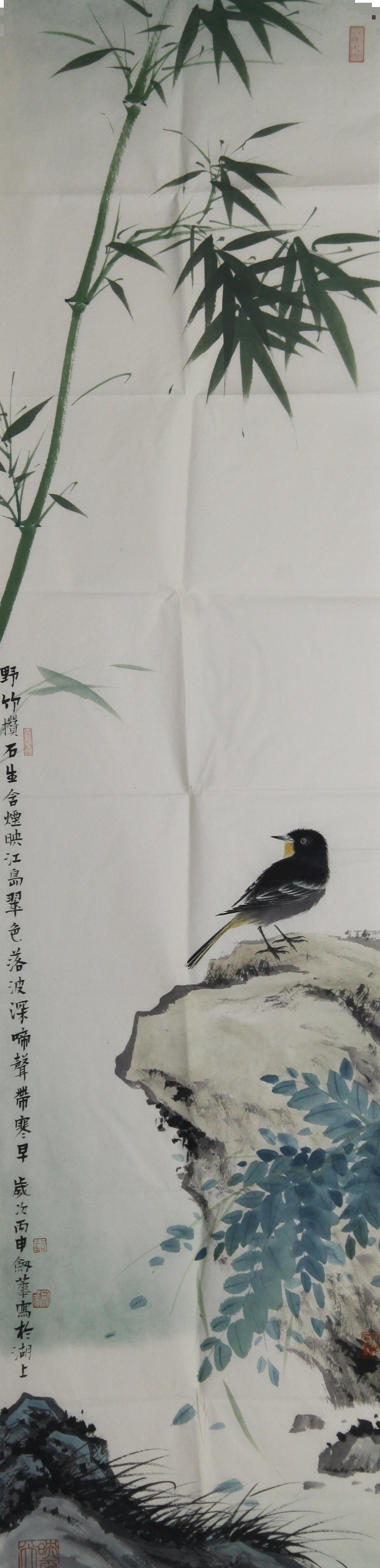 罗剑华这幅作品,尺幅不大,但元素丰富。画面底端,青石缝隙杂草丛生,整体色调偏暗。而画面上方,立于石上的小鸟,以及扶摇而上的野竹,色调明快,爽朗,对比明显。野竹颜色淡雅,有清爽之感。竹叶错落有致,透着绿色的活力。